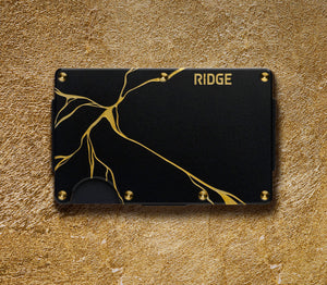 Black and gold Ridge wallet and keychain on a marble background.